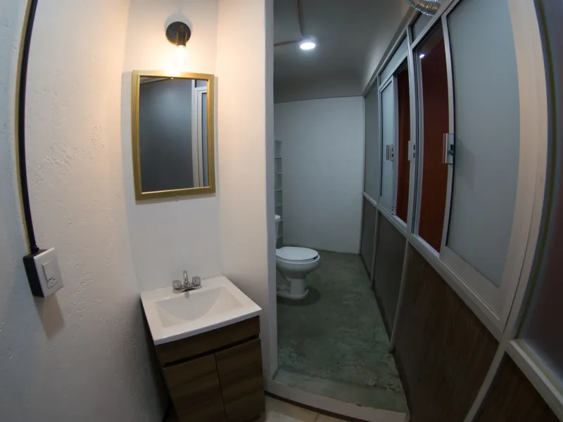 El baño completo está ubicado por separado de la habitación, ofreciendo mayor privacidad y comodidad. Cuenta con ducha, lavabo y WC, además de todos los elementos esenciales para tu bienestar durante la estancia.